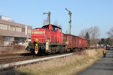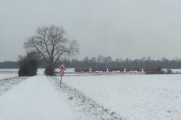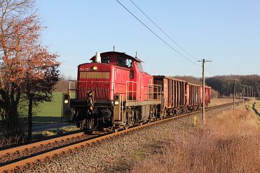 EK 53912 gehörte von Dezember 2013 bis Juni 2014 als Samstags-Zug zu den pünktlichsten Güterzügen auf den Gliesmaroder Strecken. Auf der Fahrt Knesebeck - Braun- schweig hatte er planmäßig in Gifhorn Stadt Kreuzung mit RB 14950 Braunschweig - Uelzen und erreichte Gliesmarode daher gegen 10.15, so auch am 22.02.14. | Mit 4 Eaos-Wagen zeigte sich EK 53912 "gut ausgelastet" am 01.03.14 am Querumer Forst. Im Vordergrund das seit 2010 nicht mehr genutzte Anschlussgleis zum Gewerbepark Kralenriede. | |