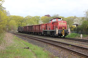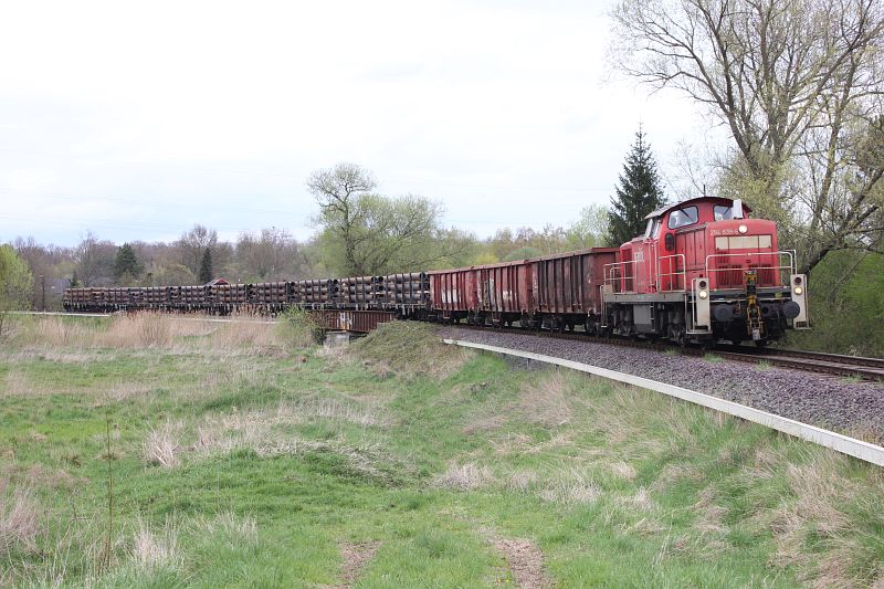 Im Frühjahr 2016 hatte EK 53920 des öfteren Rohre auf Samms-Wagen dabei, so auch am 23.04.16 an der Abzweig- stelle Lünischteich kurz vor dem Braunschweiger Rangier- bahnhof. | Sehr gut ausgelastet ist der Zug auch am 16.04.16 gewesen, 3 Eaos- und 9(!) beladene Samms-Wagen dürften schon eine vierstellige Tonnen-Zuglast ergeben haben. Trotzdem war er auch an diesem Tag pünktlich bei Querum unterwegs. | |