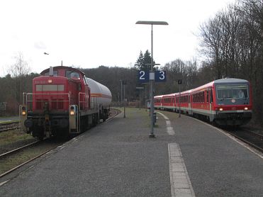 Gleis 2 ein: Die entgegenkommende RB 24757 (10.49) muß abgewartet