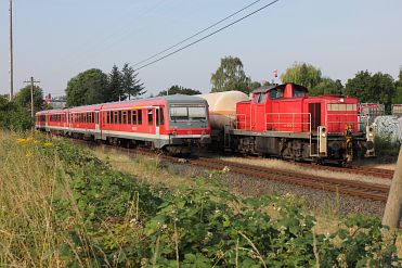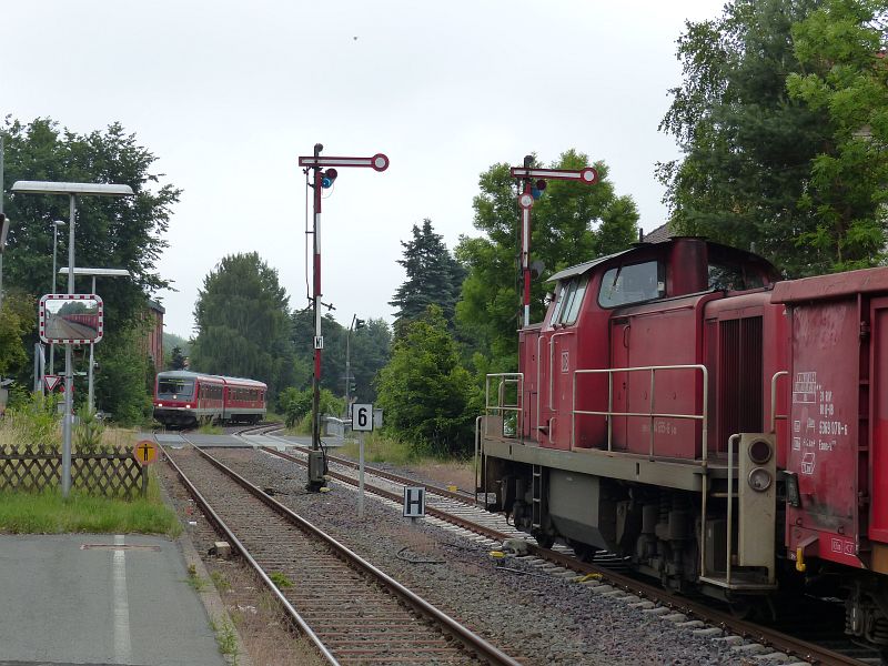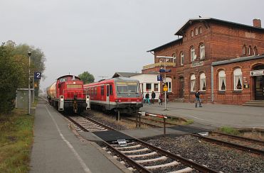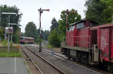 Wie im Fahrplan vorgesehen fand am 17.06.14 in Gifhorn Stadt die Zugkreuzung EK 53911 / RB 14947 um 10.18 statt  (Aufnah- me: F. Rindfleisch). Nach dem ab 15.07.14 gültigen Fahrplan verkehrte EK 53911 zeitlich deutlich früher, nunmehr war in Gifhorn Stadt die Begegnung mit RB 14945 um 8.18 vorgesehen. 294 955 hat hier auf der Hinfahrt nur einen leeren Kesselwagen aus Wenden- Bechtsbüttel dabei (02.10.14).
