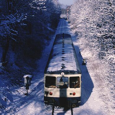 Nebenbahnmotiv gibt es auch heute noch, allerdings nur mit moderneren Fahrzeugen: Ein "bunter" Zug am