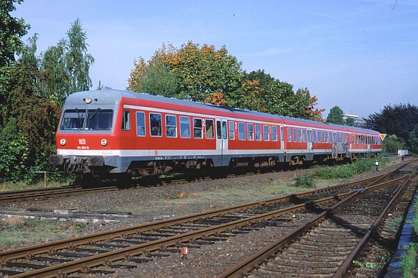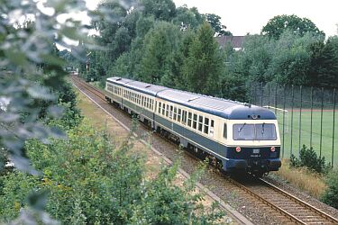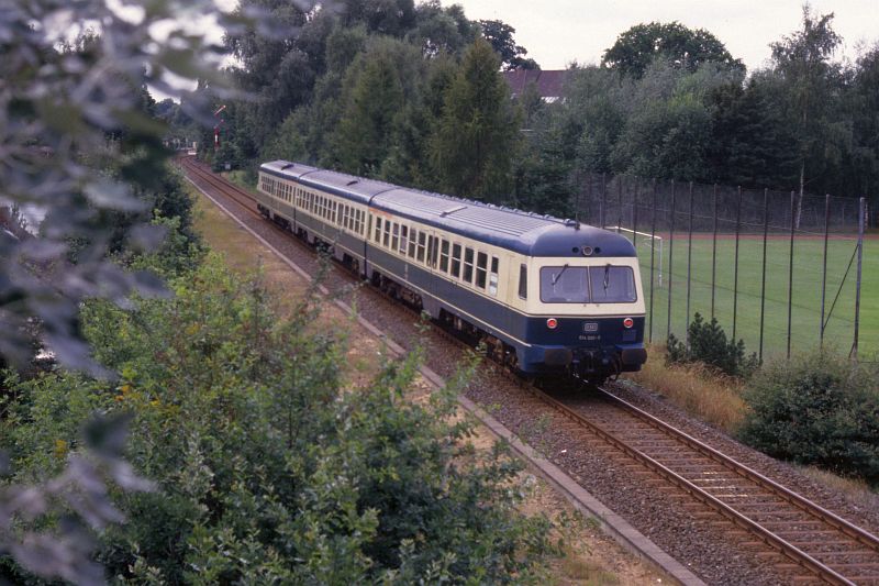E 6621 Uelzen - Braunschweig im Stadtgebiet Gifhorn, hinten das Einfahrsignal des Bahnhofs Gifhorn Stadt (am 02.09.89). |