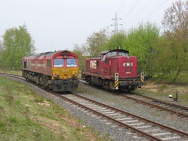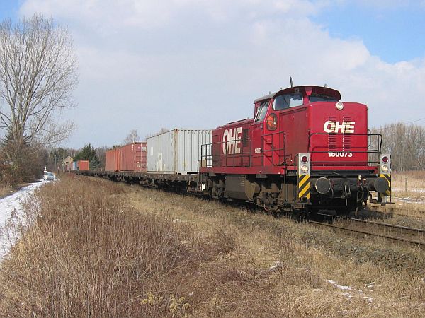 HGK-Lok DE67 (Ölzug) neben OHE-Lok 160073 (Containerzug)