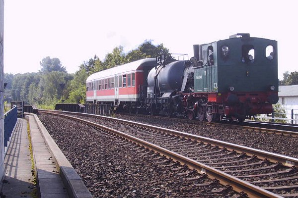 Eine ungewöhnliche Fuhre: Mit einem angemieteten DB-Wagen war die Lok "Braunschweig" am 01.09.01 nach Gifhorn Stadt un-