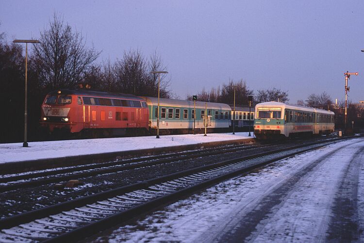 Als die Bahn noch bunter war: Am 09.01.96 begegneten sich in Gliesmarode planmäßig die RB 6612 Braunschweig - Uelzen - Soltau (628) und RB 6605 Wittingen - Braunschweig (218) um 8.52. |