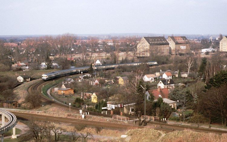 E6018 Wolfsburg - Göttingen(!) am 09.03.89 in der Kurve zwischen Braunschweig Ost und Braunschweig Gliesmarode, aufgenommen vom Gebäude der technischen Universität. Dieser Zug war montags bis freitags plamäßig als Doppeleinheit BR 634/614 unterwegs.  Bemerkenswert ist auch der "modellbahngerecht" geringe Abstand zwischen den beiden Bahnhöfen, der Zug passt gerade so zwischen die beiden Einfahrsignale! Der Aufnahmestandpunkt vom Bild des Monats 01/15 ist hier ebenfalls gut erkennbar, der Hügel am unteren Bildrand war damals nur wenig bewachsen. (Aufnahme: F. Rindfleisch)