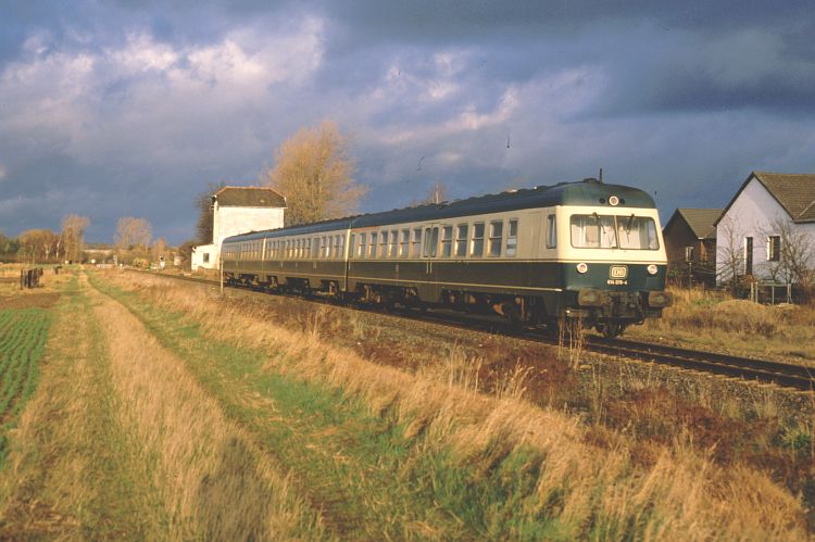 E 3487 durchfährt auf dem Weg nach Wolfsburg den ehemaligen Bahnhof Dibbesdorf-Hondelage am 13.11.1988. Den Feldweg links gibt es heute noch, das ehemalige Bahngelände ist inzwischen mit Birken meterhoch bewachsen. |