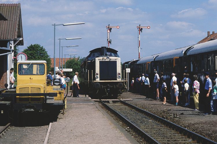 Wahrenholz am 28.05.89: Sonderzug des Vereins Braunschweiger Verkehrsfreunde nach Wittingen trifft auf Planzug E6619 Uelzen - Braunschweig mit 212 087. Der VBV-Zug war damals mit 2 Dieselloks der Baureihe V36 bespannt. |