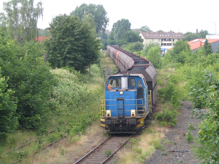 Kohleverkehr zum Heizkraftwerk Mitte im Sommer gab es schon seit vielen Jahren nicht mehr, üblicherweise fuhren die Züge nur von Anfang Januar bis Ende April. Dieses Jahr jedoch sind die Züge auch in der grünen Jahreszeit anzutreffen, hier bei der "idyllischen" Fahrt durch die Reste des ehemaligen Nordbahnhofs. CS 60385 wird sein Ziel nach wenigen hundert Metern erreichen, die Aufnahme entstand am 28.06.06. |