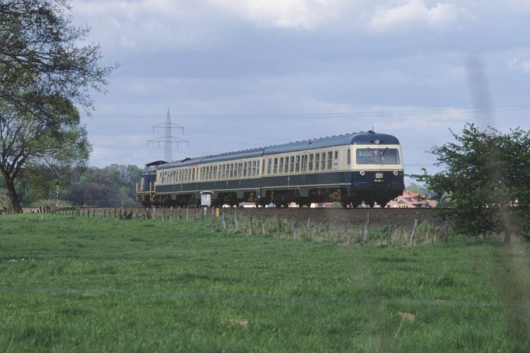 Kuriose Zugzusammenstellung: Im Fahrplan 1989/90 verkehrte auf der Schuntertalbahn samstags Lt 33906 Wolfsburg - Braunschweig mit einer 614-Einheit und einer 212 als Schlußlok. Die Auf- nahme entstand am 28.04.90 zwischen Hondelage und Wendhausen.