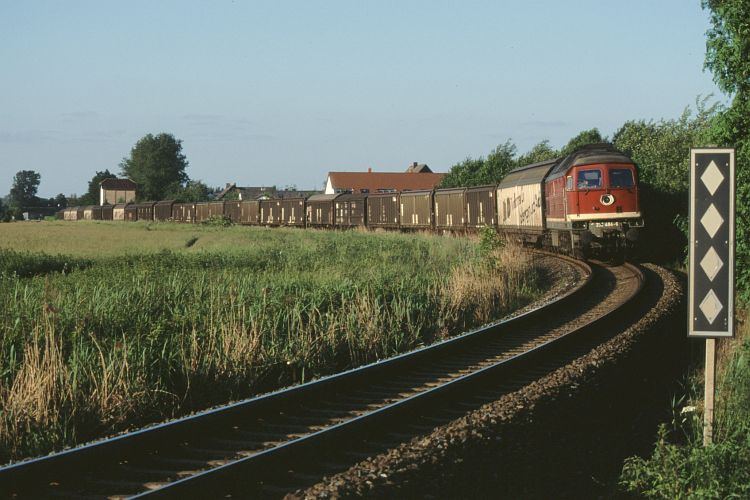Im Sommer 1996 gab es hier z.B. für einige Wochen Dg 57479 FallerslebenVW - Zwickau über Braunschweig, bespannt mit der BR 232. Am 14.06.96 ist 232 484 mit diesem Zug bei Dibbesdorf unterwegs, am linken Bildrand ist das ehemalige Empfangsgebäude des Bahnhofes Dibbes- dorf-Hondelage (bis 1983) zu erkennen. |