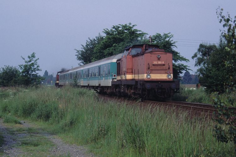 Der Fahrplanwechsel vor 20 Jahren (Sommerfahrplan 1995) brachte im Personenverkehr auf der Strecke Braunschweig - Fallersleben eine interessante Abwechslung: Die meisten Reigonalbahnen zwischen Braunschweig und Wolfsburg wurden über Oebisfelde - Haldensleben bis nach Magdeburg verlängert und mit Fahrzeugen der ehemaligen  DDR-Reichsbahn gefahren. Die Reihung 202 - 3 modernisierte "Halberstädter" - 202 war dabei der Regelfall, wobei bei den Wagen auch gelegentlich andere Typen zum Einsatz kamen (bis hin zu kompletten Zügen im alten DR-Farbschema). 202 160 ist hier mit einer Schwesterlok als RB 5759 Braunschweig - Magdeburg zwischen Querum und Dibbesdorf unterwegs, aufgenommen am 04.06.95. Den Einsatz dieser Fahrzeuge und den Laufweg gab es nur in diesem Fahrplanabschnitt, zum Sommerfahrplan 1996 war damit bereits wieder Schluss.