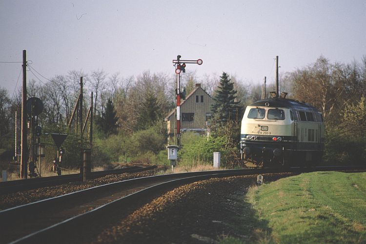 Das Einfahrsignal B des Betriebsbahnhofs Nordkurve wurde 1995 abgebaut und steht heute im Garten eines Triebfahrzeugführers in Sickte. Am 03.04.89 fuhr 218 250 als Lz 99962 über Gifhorn nach Fallersleben, Lokleerfahrten über die heutige KBS 115 waren schon damals etwas Besonderes.