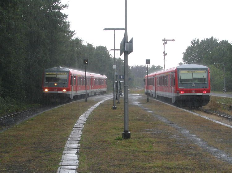 Mit rund 103 Litern pro Quadratmeter (Braunschweig Querum) war der Juli 2009 im Vergleich zum langjährigen Mittel erheblich zu naß. Im Bahnhof Gliesmarode hätte sich sicher mancher Fahrgast einen geschützten Unterstand auf Bahnsteig 2 gewünscht, so wie hier am 09.07. bei der "Zug- kreuzung im Platzregen" (links RB 24769 von Gifhorn Stadt, rechts RB 24776 nach Uelzen). |