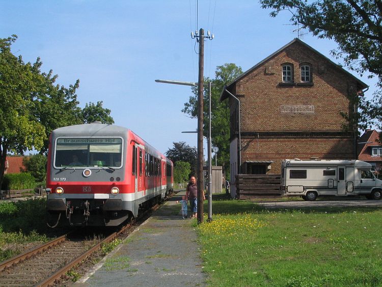 Nebenbahnidylle 2010 in Rötgesbüttel: An die Zeit als Bahnhof mit Signalen, Ausweichgleis und Güterverkehr erinnert das stattliche ehemalige Empfangsgebäude. Heute genügt ein Bahnsteig mit Wartehaus und Fahrkartenautomat für die insgesamt 22 täglich (Mo-Fr) haltenden Reisezüge (RB 24757 Uelzen - Braunschweig am 07.08.10).