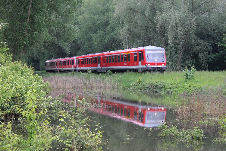 Eine geeignete Stelle für "horizontlose" Fotos ist der Bahnübergang Pepperstieg in Braunschweig Querum (Blickrichtung Süden). Ende Mai 2013 gab es zudem wieder einmal Hochwasser der hier verlaufenden Flüsschen Wabe und Mittelriede, sodass zusätzlich noch Spiegelungen möglich waren. RB 14966 Braunschweig - Uelzen passierte diese Stelle am 30.05.13 gegen 17.15.
