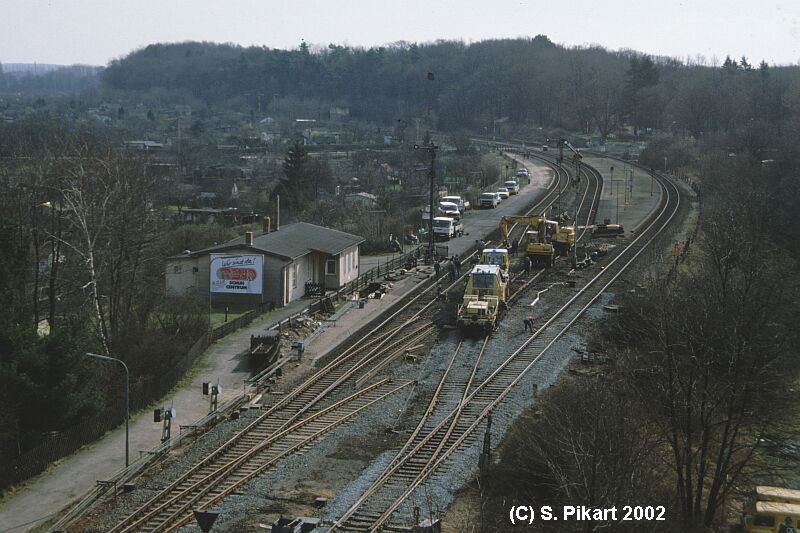 Großumbau im Bhf. Gliesmarode am 12.03.89! Im Zuge des Brückenneubaus Berliner Str. konnte jeweils nur ein Gleis im Baubereich befahren werden. Aufgrund des starken Bahnverkehrs zu dieser Zeit war es aber notwendig, sämtliche 3 Bahnhofsgleise südlich der Brückenbaustelle an dieses eine Gleis anzubinden. Seit Sommer 1988 führte der Gesamtverkehr auf Gleis 1 über die Brückenbaustelle, dazu war das Gleis 3 unmittelbar vor der Brücke mittels Bauweiche an Gleis 1 angebunden (hier links unten zu sehen, darüber die "reguläre" Weiche 5). An diesem Märzwochenende wurde dann der Betrieb im Brückenbereich auf Gleis 3 umgestellt, sodaß Gleis 1 und 2 wiederum südlich der Baustelle an Gleis 3 angebunden werden mußten. Die beiden Bauweichen dazu wurden hier gerade eingebaut. Dieser Zustand dauerte dann bis Spätsommer 1989, danach war die Brücke fertig und der Bahnhof wurde in seinen Ursprungszustand zurückversetzt.