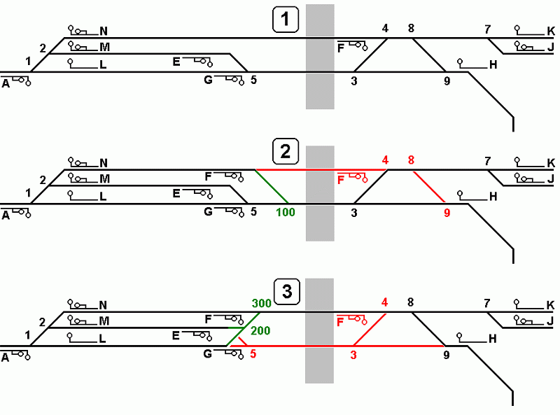 Die verschiedenen Gleispläne im Zuge des Brückenbaus Berliner Straße:  Plan 1 zeigt den regulären Zustand (bis Juni 1988, ab September 1989), Plan 2 den Bauzustand mit gesperrtem Gleis 3 (Juni 1988 bis März 1989), Plan 3 den Bauzustand mit gesperrtem Gleis 1 (März 1989 bis September 1989). Grün dargestellt sind die Baugleisanlagen, Rot die jeweils außer Betrieb befindlichen Anlagen.
