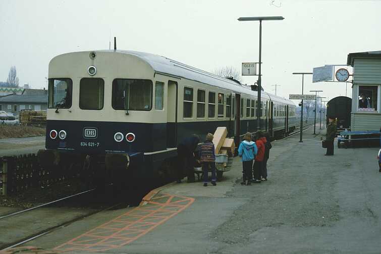 schwach das damalige Wärterstellwerk erkennbar (10.04.84). |