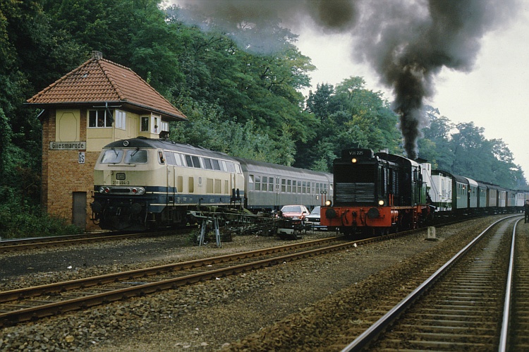 Am 01.10.10 wird Braunschweigs "neuer" Hauptbahnhof inzwischen 50 Jahre alt. Das 25-jährige Bestehen im Oktober 1985 wurde u.a. mit Dampfzugfahrten Hbf - Hafen gefeiert. Seinerzeit hatte der Verein Braunschweiger Verkehrsfreunde (VBV) 2 Zuggarnituren in Betrieb, hier V36 225 mit Dampflok "Hafen 2" bei einem Überholungshalt in Gliesmarode am 06.10.85. Der Ferneilzug E 3217 Kiel - Kassel hatte Vorrang!