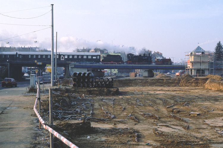 Nikolausfahrt im Jahr 1989: Der VBV-Museumszug überquert auf dem Weg zum Nordbahnhof die Brückenbaustelle Berliner Strasse. Die eigentliche Nikolausfahrt führte dann vom Nordbahnhof nach Wendezelle (ehem. Strecke Richtung Celle) und zurück.