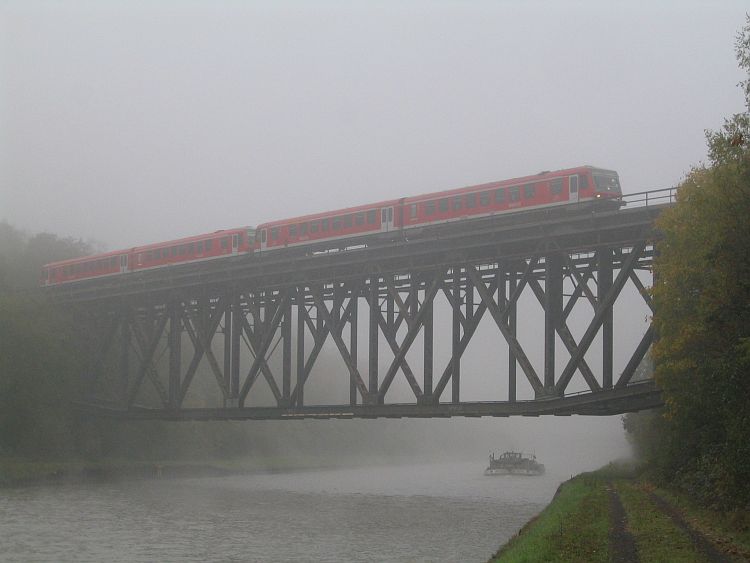 Herbstzeit ist auch Nebelzeit: RB 24760 nach Uelzen überquert den Mittellandkanal bei Bechts- büttel am 18.10.10. Der Schiffsverkehr läuft dank Radartechnik reibungslos, die Eisenbahn benötigt solche Hilfsmittel nicht...