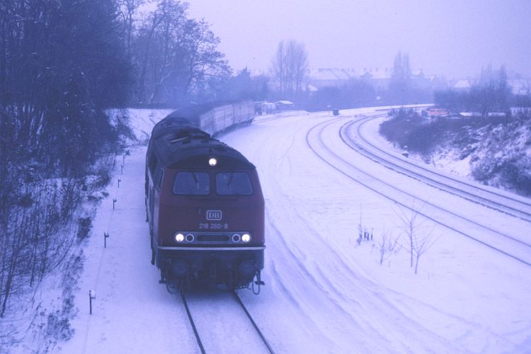 218 260 (Bw Lübeck) zieht mit einer Schwesterlok den E 3229 (Flensburg - Kreiensen) durch Gliesmarode, 19.01.85. Das Stellwerk GS war zur damaligen Zeit öfter "Ansprechpartner" bei Unfällen allzu rasanter Schlittenfahrer am nahegelegenen Nußberg; hier wartet gerade ein Notarztwagen am Bahnübergang. |
