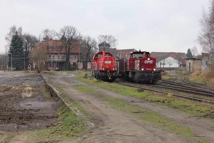 Am 30.11.13 trafen sich in diesem Bahnhof OHE 1500 02 mit Ng 53768 (Wittingen West - Celle Nord) und DB 265 010 (Streckenkundefahrten für DB-Lokführer). |