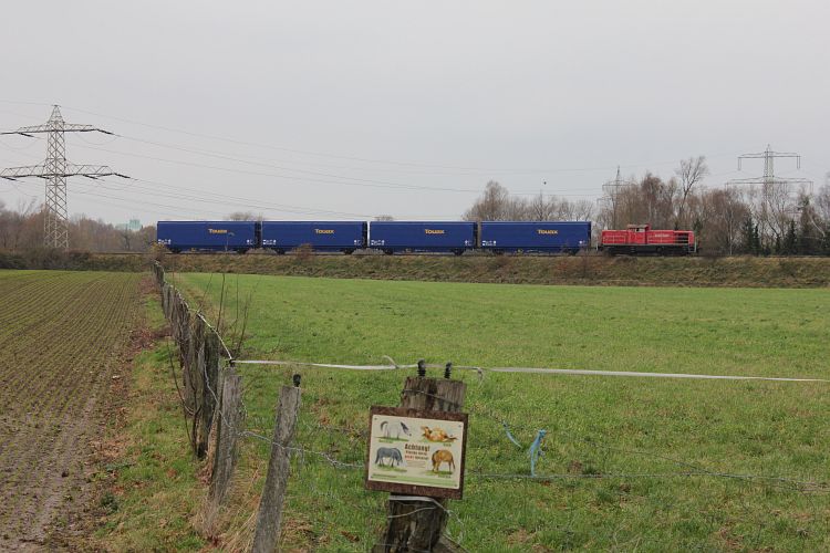 Neben den Müllzügen von und zur Verladestation Braunschweig-Watenbüttel gibt es auf der ehemaligen Strecke Braunschweig - Celle seit Oktober 2015 auch wieder regelmäßigen Verkehr bis Harvesse. Das dortige neue VW-Logistikzentrum ist über das werktägliche Zugpaar EK 53893/53894 mit dem VW-Werk in Braunschweig-Rühme verbunden, eingesetzt wird die BR 294. Am 16.11.15 fuhr 294 774 als Lokleerfahrt nach Harvesse und kehrte später mit 4 Wagen als EK 53894 zurück, hier auf dem Damm in der Okerniederung bei Braunschweig-Ölper.