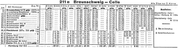 Neben diesem Güterzugpaar gab es zeitweise weitere Züge, so in den 60er Jahren einen Bedarfs-Viehzug ab Harvesse nach Braunschweig oder Bedarfs-Durchgangsgüterzüge Hamburg - Celle - Braunschweig in den 50er Jahren. Zu den eingesetzen Fahrzeugen: Seit 1975 waren auf der Strecke nur noch Kleinloks (BR 332/333) im Einsatz, vorher fuhr die V60 (260) im Güterzugdienst (seit ca. Anfang der 60er Jahre). Im Personenverkehr waren ab Sommerfahrplan 1955 fast ausschließlich Schienenbusse unterwegs, hierfür wurden sogar neue Haltepunkte in Eickenrode, Wipshausen Süd und Braunschweig Rühme angelegt (Bedarfshalte). Die Einstellung des Güterverkehrs folgte abschnittsweise: Wathlingen - Uetze 30.05.1976, Rückbau 1976 Nienhagen - Wathlingen 02.06.1985, Rückbau 1986 Celle - Nienhagen 29.09.1990, Rückbau 1991 Uetze - Harvesse 31.12.1991*, Rückbau 1996 Harvesse - Braunschweig 31.12.1993**, kein Rückbau! *nach anderen Quellen bereits am 13.05.1991 ** planmäßiger Zugverkehr endete bereits zum Fahrplanwechsel 1992. Der Abschnitt wird zum 01.01.95 stillgelegt, nach anderen Quellen erst zum Jahresende 2008(!). Die noch vorhandene Strecke Abzweig Hafen - Harvesse blieb ab 1992 ungenutzt liegen, es verkehrten hier nur noch einige Sonderzüge. Die letzte(?) Fahrt fand am 11.12.94 statt, der Verein Braunschweiger Verkehrsfreunde veranstaltete eine Nikolausfahrt nach Wendezelle. 1998 schließlich wurde der Abschnitt Abzw. Hafen - Watenbüttel Kanalbrücke komplett erneuert und ein neuer Anschluss zur RAUA (Restabfallumschlagsanlage) nördlich des Kanals gebaut. Die Strecke in Richtung Celle wurde dabei erst einmal "abgeklemmt", die Gleise bis Harvesse blieben jedoch weiterhin liegen. Seit November 1998 fährt ein Zugpaar mit Müllcontainern von der RAUA zur Verbrennungsanlage nach Staßfurt (bis 2007 Buschhaus bei Schöningen, bis 2008 Bremerhaven). 2014 baut die VW-AG in Harvesse östlich des Ortes ein neues Logistikzentrum, dieses erhält auch eine Gleisanschluss an die immer noch liegende Harvesser Strecke. Zur Wiederinbetriebnahme erfolgen umfangreiche Rodungs- und Rückschnittarbeiten sowie eine Durcharbeitung und teilweise Erneuerung des Oberbaus. Ab Oktober 2015 verkehrt ein Güterzugpaar zwischen RühmeVW und Harvesse Logistikzentrum, dieser Verkehr wird jedoch schon im Frühjahr 2017 wieder eingestellt. Sicherungstechnisch wird auf der Strecke schon seit dem Fahrplanwechsel 1963 im Zugleitbetrieb gefahren, verantwortlicher Fahrdienstleiter war hierfür zunächst Bahnhof Uetze, von 1972 bis Ende 2010 das Stellwerk in Rühme ("Rf"). Nach Entfall dieser Dienststelle hat diese Aufgabe der Fahrdienstleiter in Gliesmarode übernommen. |