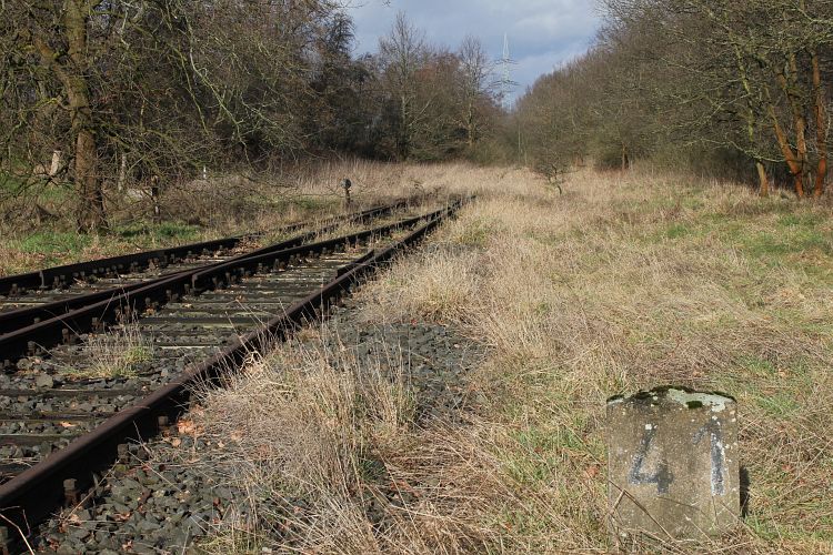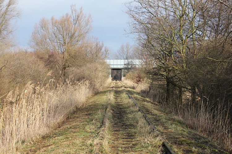 ![]() Wir nähern uns der Autobahnbrücke (A2). Auf den Abschnitten mit Holzschwellenoberbau hat sich der Grasbewuchs deutlich besser entwickelt als auf den Abschnitten mit Stahlschwellen. ![]() Naturgewalt: Dieser Baum hat sich mitten durch eine Holzschwelle gebohrt - hier ist bei der Gleiserneuerung wohl etwas Wurzelrodearbeit angesagt. ![]() Kurz vor Harvesse: Hinter dem Bahnübergang wird das neue Gleis zum Logistikzentrum im Bogen Richtung Nordosten schwenken. ![]() Hier dagegen wird wohl nie wieder etwas fahren: Blick vom Bahnübergang der L321 Richtung ehem. Bahnhof Harvesse. ![]() Der Kilometer 41,0 an der Nordausfahrt Harvesse - nach rund 700m endet das Streckengleis im Gebüsch. ![]() Selbst in der laublosen Jahreszeit war etwas Sucharbeit nötig, um das Streckenende zu finden: Der Kilometer 40,7 nördlich von Harvesse. ![]() Hier wird zukünftig das Umsetzgleis kurz vor dem Logistikzentrum liegen: Bisher deuten nur ein paar farbige Pflöcke auf das Projekt hin. ![]() Noch befindet sich hier ein Feld, bald wird hier eine Halle stehen. Nach den VW-Planungen wird man von dieser Stelle später direkt auf die Gleiszufahrt des Logistikzentrums blicken... Nachtrag: Zur Grunderneuerung dieser Strecke ab Frühjahr 2015 siehe Aktuelles 2015. |
