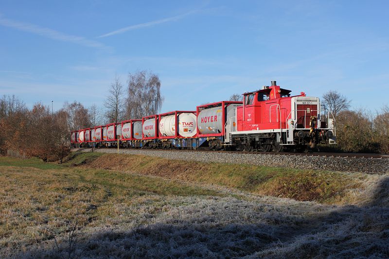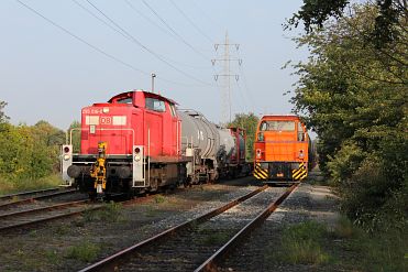 Von der DB wird der Braunschweiger Hafen am frühen Morgen bei Bedarf durch eine "normale" Übergabefahrt bedient. Befördert werden hier meist VTG - Wagen zur Abstellung im Hafen, daneben aber auch Eaos-Wagen im Schrottverkehr. 295 015 übernimmt am 02.09.11 im Übergabebahnhof der Hafenbahn FZ 53934. | Nachdem der Schienen-Containerverkehr zwischen Braunschweig Hafen und Hamburg im Sommer 2016 nach 13 Jahren eingestellt wurde, gibt immerhin noch einen Direktverkehr zwischen Braunschweig Hafen und Wolfenbüttel-Linden. Dieser wird von der in Wolfenbüttel ansässigen Firma "Blöß Lokdienste" gefahren, 365 221 ist am 28.11.16 kurz hinter dem VW-Werk in Rühme Richtung Gliesmarode unterwegs. | |