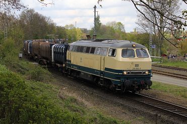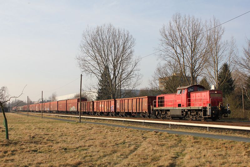 Montags bis freitags verkehren 2 Zugpaare zwischen Braunschweig Rbf und dem VW-Werk in Rühme. Ziemlich lang war der Frühzug EK 93511 Braunschweig Rbf - RühmeVW mit 294 955 am 17.03.15, hier zwschen Gliesmarode und dem ehemaligen Betriebsbahnhof Nordkurve. | Dreimal in der Woche befördert die AVG (Ascherslebener Verkehrsgesellschaft) den Braunschweiger Restmüll zur Verbrennungsanlage in Staßfurt. Der beladene Zug verkehrt montags/mittwochs/freitags, der Leerzug kommt am Folgetag frühmorgens wieder zurück. Im Frühjahr 2017 war die AVG-215 004 vor dem Zugpaar eingesetzt, wie hier am 26.04.17 bei der Durchfahrt Gliesmarode. | |