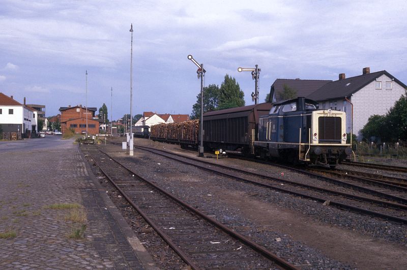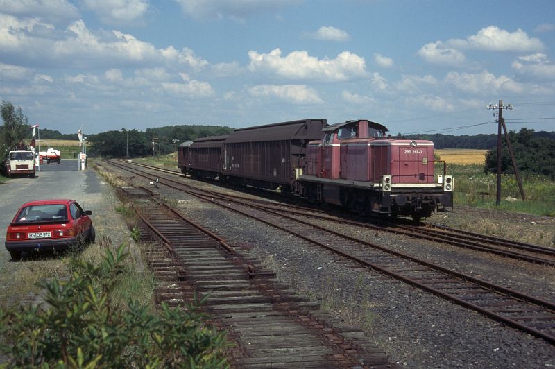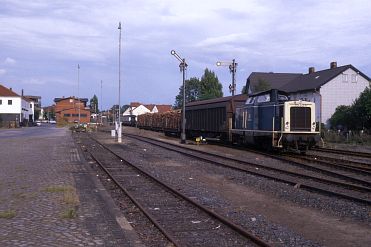 Gifhorn Stadt im Jahre 1988: Der Übergabezug aus Triangel trifft hier auf E 6636 nach Uelzen (ganz hinten). Die hier noch sicht- baren Nebengleise wurden 1996(?) entfernt, heute hat der Bahnhof Gifhorn Stadt nur noch 2 Weichen für das verbliebene Ausweichgleis. | Am 07.08.97 fuhr planmäßig die BR 290 vor dem Üg 67046 aus Triangel/Gifhorn, hier im Bahnhof Wenden-Bechtsbüttel. Auch dieser Bahnhof wurde in mehreren Stufen rückgebaut, 1997 fehl- te bereits das ehemalige Ladestraßengleis. | |
