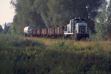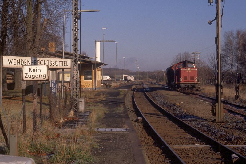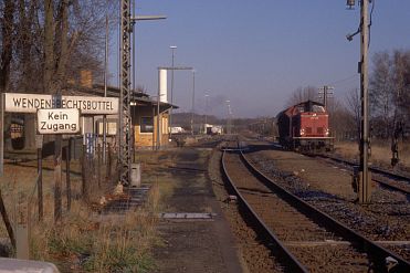 1989/90 gab es keine planmäßige Übergabefahrt von Gifhorn über Meine. So war dieser 2-Wagen-Sonderzug am 25.11.89 in Wenden-Bechtsbüttel schon etwas Besonderes... | Im Jahresfahrplan 1996/97 gab es einen bemerkenswerten Um- lauf: Eine kombinierte Fahrt, die neben dem Gifhorner Raum auch Wenden-Bechtsbüttel bediente. Üg 67042 ist hier hinter Gliesmarode schon zum zweiten Male Richtung Norden unter- wegs, am Zugschluß ein Kesselwagen aus Wenden- Bechtsbüttel (Aufnahme vom 07.10.96, Ablauf vergl. auch Bild des Monats 05/2006) | |
