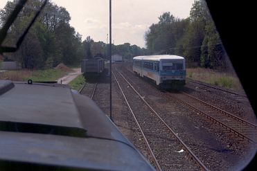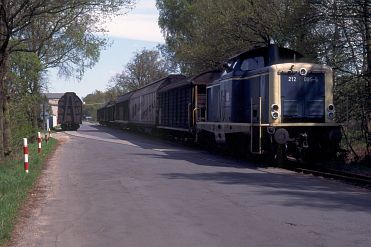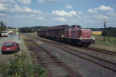 Besonders interessant war der Anschluß TDW (Triangeler Dämmstoffwerke) im "Großen Moor" bei Triangel. Vom dortigen Bahnhof zweigte eine Anschlußstrecke ab; die Gleise lagen teilweise direkt am Straßenrand, im Werksbereich z.T. mitten in der einzigen Zufahrtsstraße. 212 085 wechselt hier im Mai 1996 einige Wagen aus. | Im Bahnhof Triangel sind vor der Rückfahrt in Richtung Gifhorn noch einige Rangierarbeiten fällig, hierbei kommt es zur Be- gegnung mit RB 6616 nach Uelzen. Der Koksbehälterwagen links ist für die Fa. Teves in Gifhorn bestimmt (Aufnahme vom Mai 1996). | |