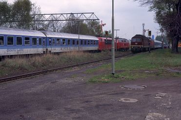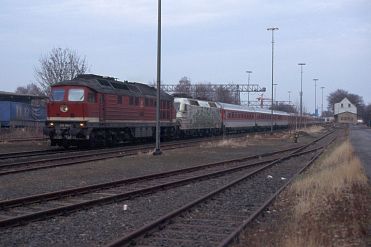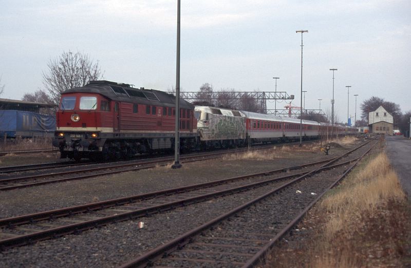 um 16.25 durchfährt IC 505 Dresden-Basel mit ei-ner 232 und einer 120 (in Werbelackierung) den Bhf. Braunschweig