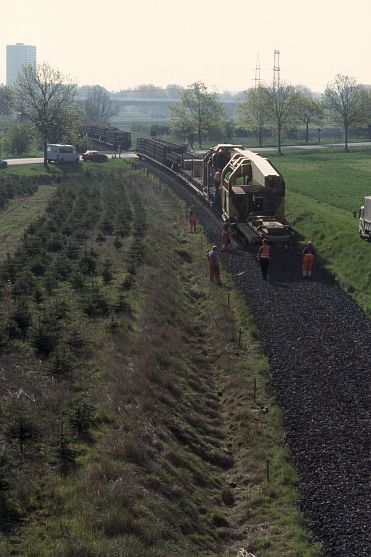 schiebt ihren Bauzug im Schritttempo Richtung Waten- büttel. Am 06.05.98 lag das Gleis bereits wieder auf