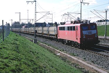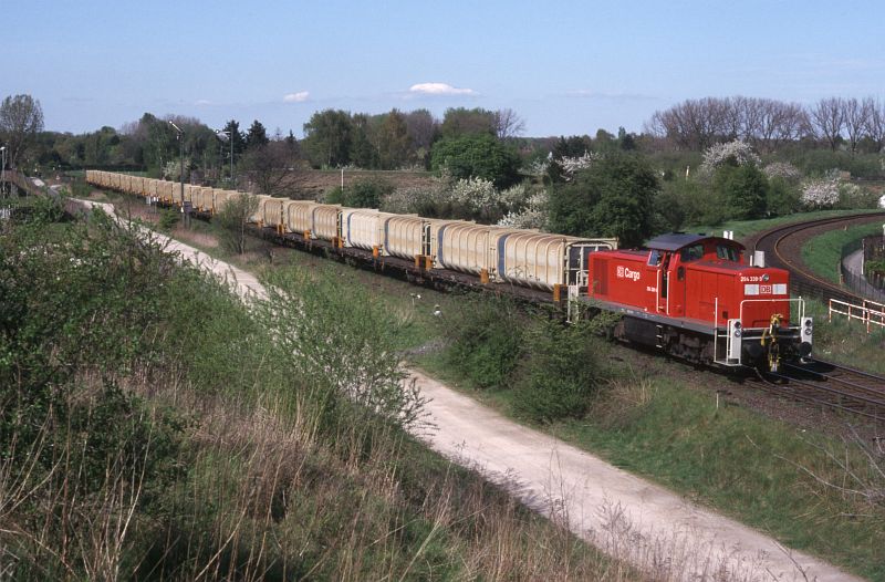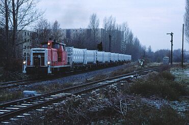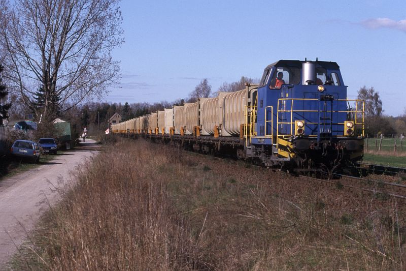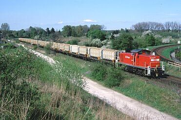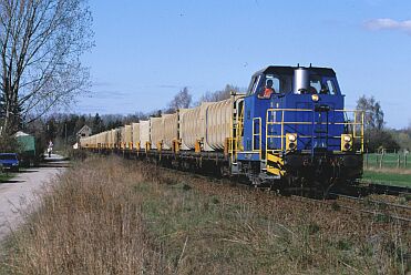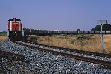 Zunächst wurde eine Art "Pilotbetrieb" mit verkürzter Zuggarnitur und einer BR 365 als Zuglok gefahren. CB 66879 Watenbüttel - Buschhaus passiert am 20.11.98 den Abzweig Hafen. Auffällig die noch sehr "frisch" aussehenden Container und das erneuerte Gleis. | Am 25.04.00 hat CB 55687 seine Fahrt gerade begonnen. Das Anschlußgleis vom Deponiegelände führt in einer engen Kurve (Radius 150m) auf die bestehende Strecke. Links die einst bis Celle weiterführende Strecke, die Gleise hier blieben liegen, wurden aber nicht angebunden (vergl. Bahnhöfe dieser Strecke). | |