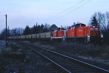 2 Beispiele für ungewöhnliche Zuglokomotiven vor dem Müllzug: Mit VPS-Lok am 05.04.00... | ... und mit Vorspannlok (Maschinenschaden an der Zuglok) am 27.02.01. Beide Aufnahmen entstanden zwischen dem ehem. Betriebsbahnhof Nordkurve und Gliesmarode. | |