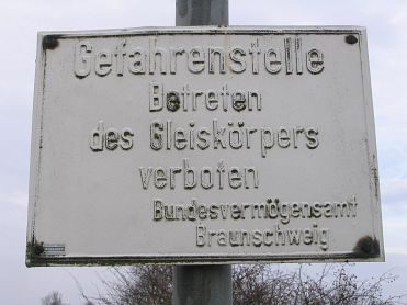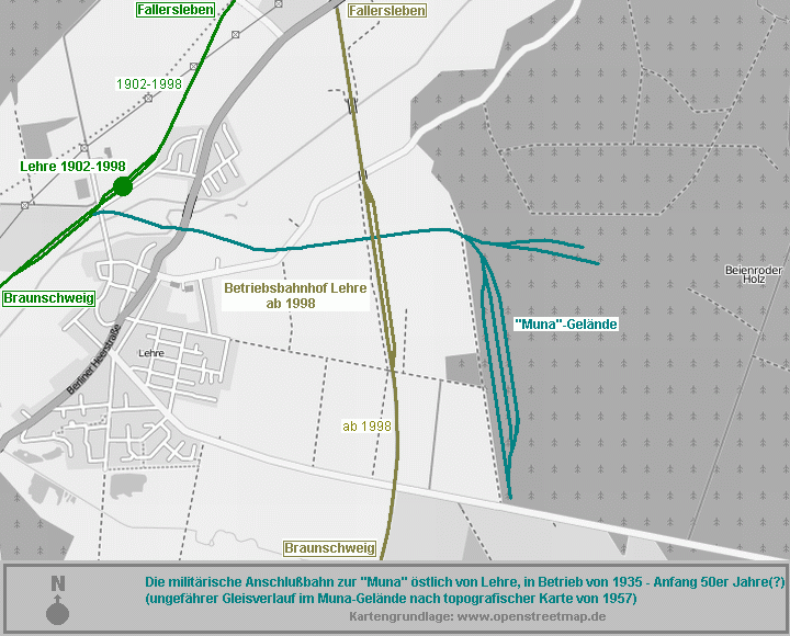 Anschlußbahn nicht mehr. Die Strecke überquerte in Lehre zunächst die Schunter und später die Bundesstraße 248. Am ehem. Bahn- übergang der Straße Lehre - Flechtorf lassen sich noch heute Gleisreste entdecken. Kurz dahinter kreuzt die Trasse den Damm der heutigen Neubaustrecke "Weddeler Schleife" direkt im Bereich des Überhol- und Kreuzungsgleises (Betriebsbahnhof Lehre). Das ehem. Betriebsgelände im Wald ist auch heute noch einge- zäunt und nicht öffentlich zugänglich. |