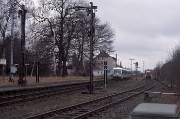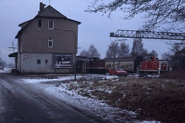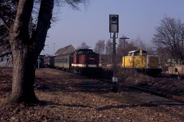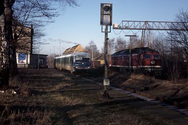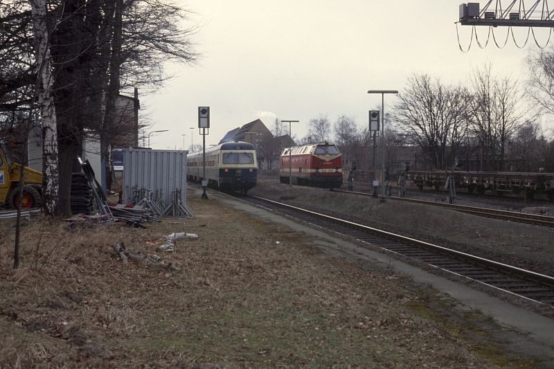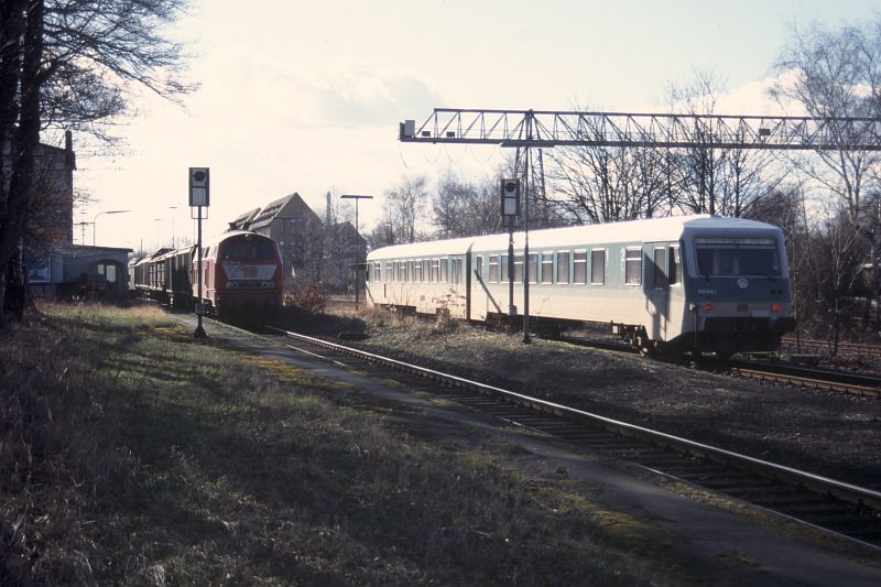 Heute sehr fremdartig anmutende Durchläufe gab es noch 1993: E 6024 Wolfsburg - Braunschweig - Paderborn(!) durchfährt Braunschweig Ost planmäßig gegen 14:50. Am 23.02.93 wartete auf Gleis 2 219 066 auf die Weiterfahrt Richtung Fallersleben. | Personenzüge sollten möglichst nicht zum Halten kommen, manchmal ließ es sich aber nicht vermeiden: 628 546 als RB 8088 Wolfsburg - Braunschweig muss erst die Durchfahrt des langen CB 67073 mit 218 192 nach FallerslebenVW abwarten (09.03.98). | |