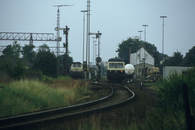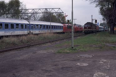 Vom Bahnübergang Karl-Hintze-Weg ließen sich mittels Teleobjektiv ebenfalls Zugbegegnungen aufnehmen: Leider sind zu dieser Aufnahme aus den 1980er-Jahren keine näheren Daten mehr bekannt. | Eine der wohl ungewöhnlichsten Zugkreuzungen fand am 03.05.96 statt, als mehrere Fernzüge wegen einer Betriebsstörung zwischen Braunschweig und Magdeburg über Fallersleben - Wolfsburg umgeleitet werden mussten (vergl. auch Fotoseite IR/IC-Umleitungen). Auf Gleis 2 wartet IR 2341 Hoofdorp - Berlin auf die Weiterfahrt Richtung Osten, in Gegenrichtung ist IR 2484 Dresden - Norddeich unterwegs. | |