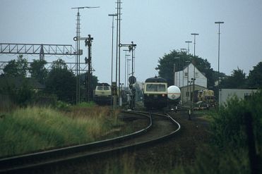 Ausweichgleis 2 war mit 525m Nutzlänge nur für kürzere Güterzüge geeignet. Unkritsch war dies bei den "SST-Zügen" Sazgitter-Beddingen - FallerslebenVW im Fahrplan 1995/96, da diese nur aus einer 360 mit 1-3 Großraumwagen bestanden. Üg 66101 mit 360 871 muss am 09.01.96 auf RB 5758 aus Magdeburg(!) warten. Diese Regionalzüge der Relation Magdeburg - Wolfsburg - Braunschweig fuhren nur im Fahrplan 1995/96 und bestanden aus 2 Loks der BR 202 (Spitzen- und Schlusslok). | V100 Ost trifft V100 West: Am 08.03.96 ist RB 5763 aus Magdeburg Richtung Braunschweig Hbf unterwegs und trifft in Braunschweig Ost auf 211 341 der Gleisbaufirma Wiebe. | |