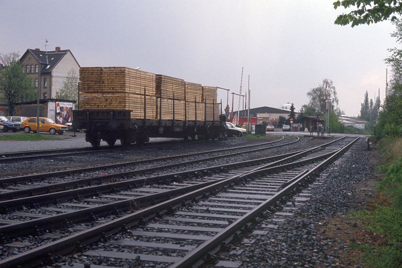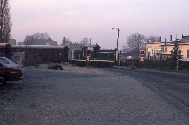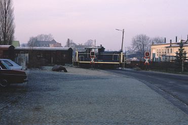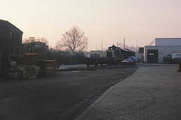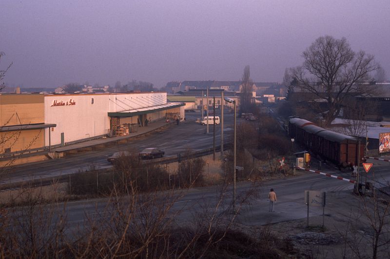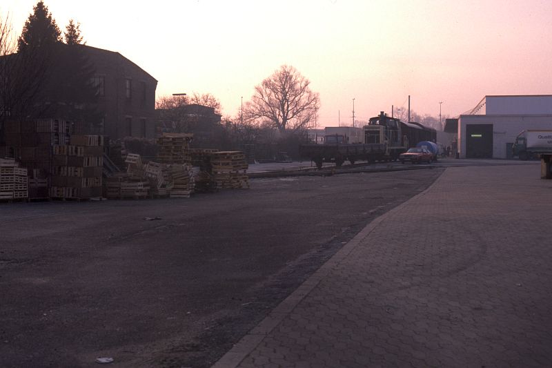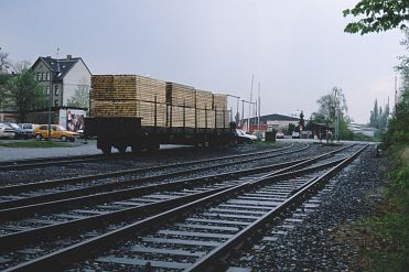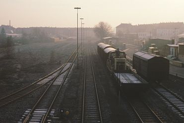 Holz für die Fa. Becker war zuletzt "gängiges Frachtgut" an der Ladestelle Celler Str.: Am 20.04.89 wartet ein gut gefüllter Waggon auf seine Entladung an der Ladestraße. Zu dieser Zeit wurde der Bahnübergang Celler Str. (rechts erkennbar) bereits nicht mehr befahren, rechts ging es einst über die Okerbrücke zum Nordbahnhof. | Schon 1989 war es Glückssache, eine Übergabefahrt nördlich des Westbahnhofs zu erwischen. Meist wurde nur noch bis zum Großmarkt gefahren, wie hier am 27.12.89 mit 361 439. Der leere K-Wagen wurde vorher von der Celler Str.geholt, leider kam der Fotograf hierfür zu spät! | |