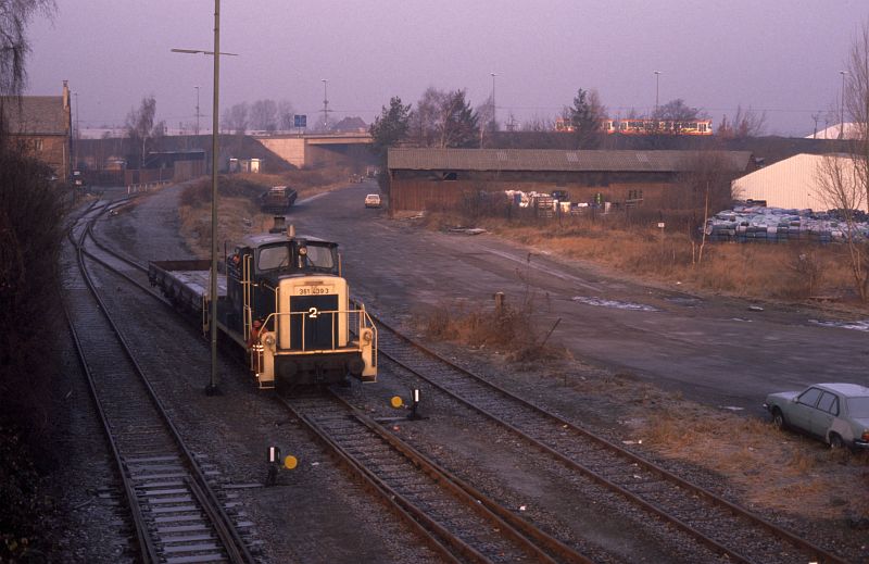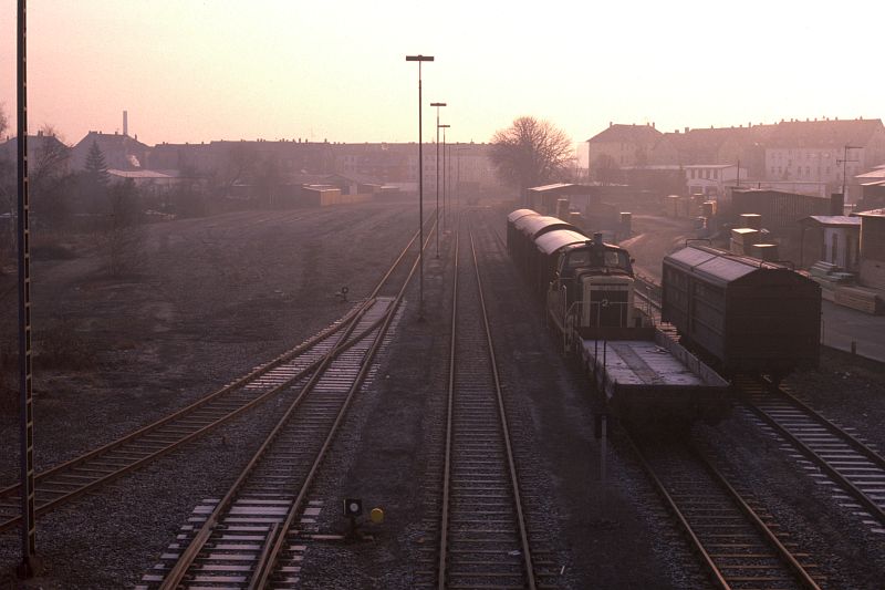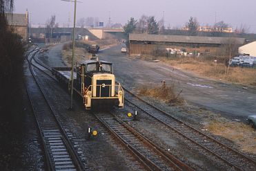 361 439 rangiert im Westbahnhof, im Hintergrund die Brücke Münchenstr. mit Straßenbahnzug der Linie 3. Über dem Flach- wagen ist noch das Gleisbett zum Ablaufberg zu erkennen, Gleis 14 wurde damals noch als Abstell- und Ladegleis genutzt (vergl. Bahnhofsseite Westbahnhof). | Auch wenn der Westbahnhof schon weitgehend zurückgebaut war, gab es hier 1989 noch regelmäßigen Verkehr. Links der Anschluß zur Fa. Sichler, das Anschlußgleis wurde im Zuge der Rückbauaktionen 1986-89 an anderer Stelle neu angebunden! 1997 war dann aber auch hier Schluß... | |