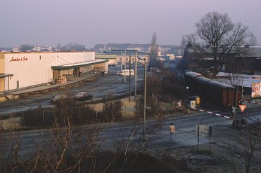 Der Bahnübergang Pippelweg nördlich des Großmarktes besaß als einziger auf der gesamten Ringbahn eine Blinklichtanlage. Die übrigen 7(!) Übergänge zwischen Westbahnhof und Celler Str. besaßen handbediente Schrankenanlagen, entsprechend aufwendig und zeitraubend war eine solche Übergabefahrt! | Blick von der Brücke Münchenstr. auf die Ringbahnstrecke mit dem Bahnübergang Broitzemer Str., links das Großmarktgelän- de mit Gleisanschluß. Die Übergabeeinheit wird hier Richtung Westbahnhof geschoben (27.12.89). | |
