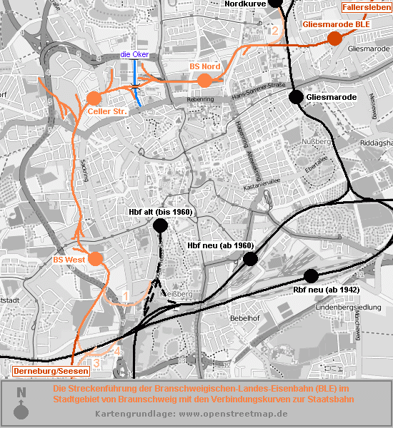 gesteigert wurde. Nach 1945 begann auch der Niedergang des Güterverkehrs, viele Industriebetriebe wurde geschlossen oder verlagerten ihre Produktion. Mit der Stilllegung des alten Braunschweiger Hauptbahnhofs im Jahr 1960 wurde eine neue Anbindung des Westbahnhofs notwendig, es entstand die Verbindungskurve direkt zum Rangierbahnhof (4, siehe Karte). Aber auch diese konnte den weiteren Rückgang des Verkehrsaufkommens nicht verhindern. 1972 wurde die Okerbrücke der Ringbahn (siehe Karte) gesperrt, ein durchgehender Zugverkehr war damit nicht mehr möglich und auch nicht notwendig. Der westliche Ast wurde nun ausschließlich über die Verbindungskurve von 1960 angefahren, der östliche Ast über Gliesmarode - Nordkurve. Nachdem nach und nach die Anschlußgleise stillgelegt wurden begann 1990 auch die Stilllegung der eigentlichen Strecke zunächst auf dem westlichen Ast: Ende 1990 war der Güterbahnhof Celler Straße nicht mehr erreichbar, ab 1992 war die Strecke bereits nördlich des Großmarkts (ca. 200m nördlich des Westbahnhofs) gesperrt und ab 1995 endete der Restbetrieb vom Rangierbahnhof im Westbahnhof. 1995/96 wurden die Gleise im Abschnitt Westbahnhof - Celler Straße entfernt. Ende 1997 wurde auch der Westbahnhof selbst nicht mehr angefahren, damit endete der Eisenbahnbetrieb auf der westlichen Ringbahn. Ab 2003 wurde auf dem gesamten westlichen Ring von der Okerbrücke bis zum Westbahnhof ein Radweg auf der ehemaligen Eisenbahntrasse angelegt, der sich großer Beliebtheit erfreut (zu diesem Thema siehe auch die Webseiten www.ringgleis.de und www.braunschweigerzeitschiene.de). Weiterhin in Betrieb ist dagegen noch der östliche Ast der Ringbahn ab Braunschweig Nordkurve. Von hier fahren noch Güterzüge über den gleismäßig sehr stark zurückgebauten Nordbahnhof bis zum kurz vor der Oker gelegenen Heizkraftwerk Mitte, in den Wintermonaten erhält das Kraftwerk auch komplette Kohlezüge. Dieses Streckenstück ist damit der letzte noch betriebene Rest der ehemaligen Braunschweigischen Landes-Eisenbahn im Stadgebiet Braunschweig. |