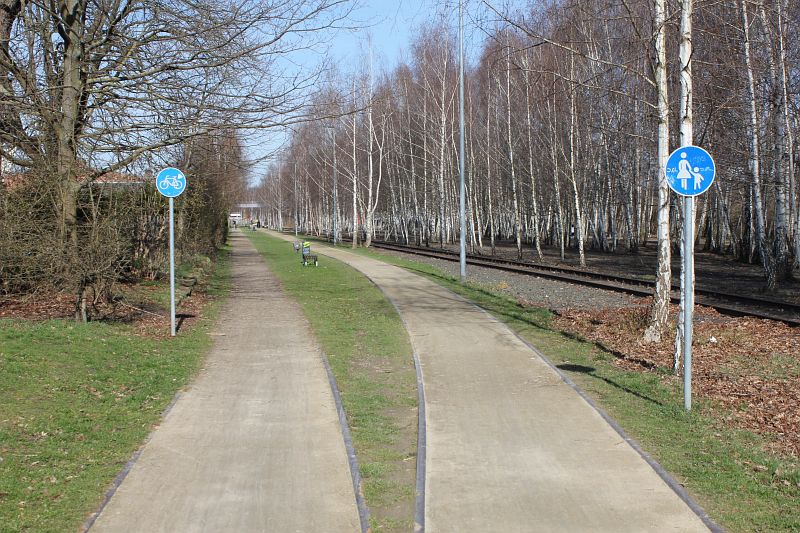 beachte: Radfahrer nach Gleis 1, Fußgänger nach Gleis 2!
