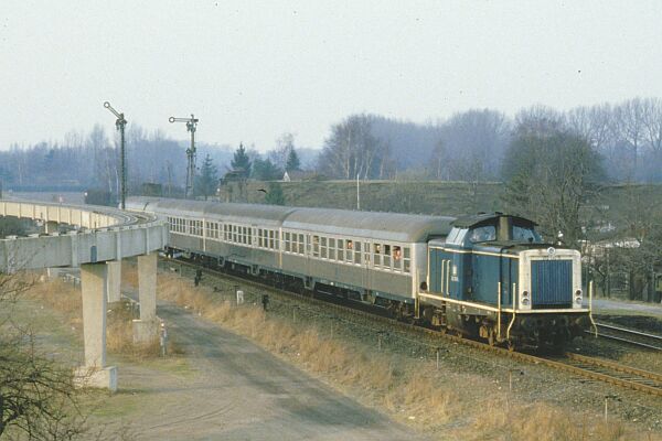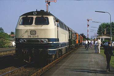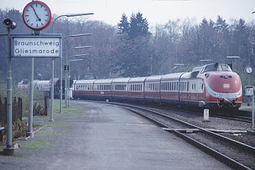 Die Kirchengemeinde Riddagshausen bestellte über mehrere Jahre im Frühjahr den Sonderzug "Nußberg-Expreß" ab Glies- marode. Am 19.05.85 bestand er aus einer 216 und 3 Umbau- wagen Byg. | Vt 601 auf Gleis 2: 1985 waren diese Züge noch im regelmäßi- gen Reisebürosonderdienst eingesetzt. Auf einer Überführungs- tour besuchte der Zug die Strecke Braunschweig - Fallersleben am 19.04.85. | |
